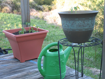 One year I tried growing tomatoes in a pot on our back deck.... the plant produced one measly tomato before keeling over. I later received advice from 'true gardeners'..... they said my pot was too little. So, I decided to give it another try- today I found a pot so large I could sit in it. Ha!